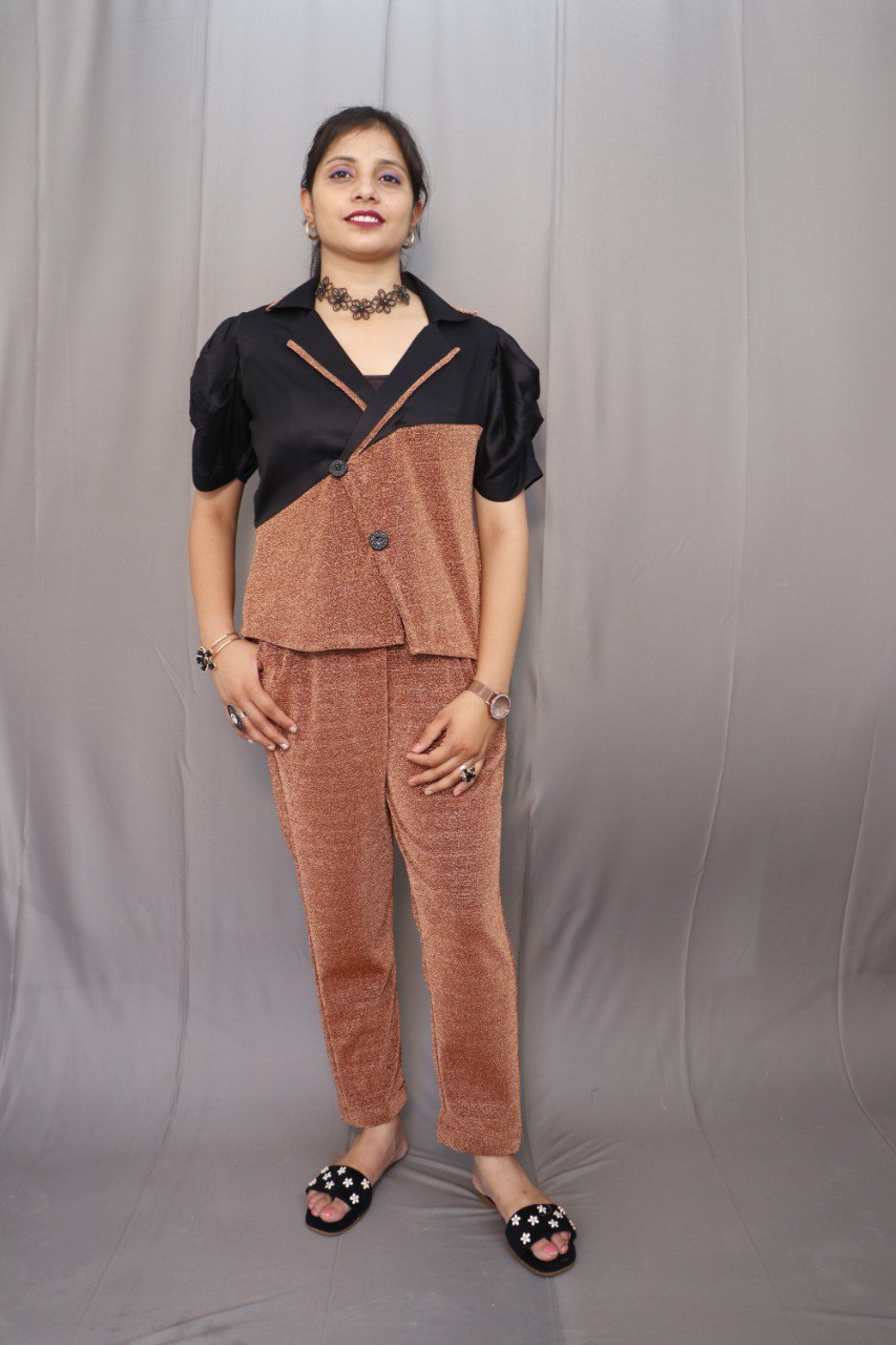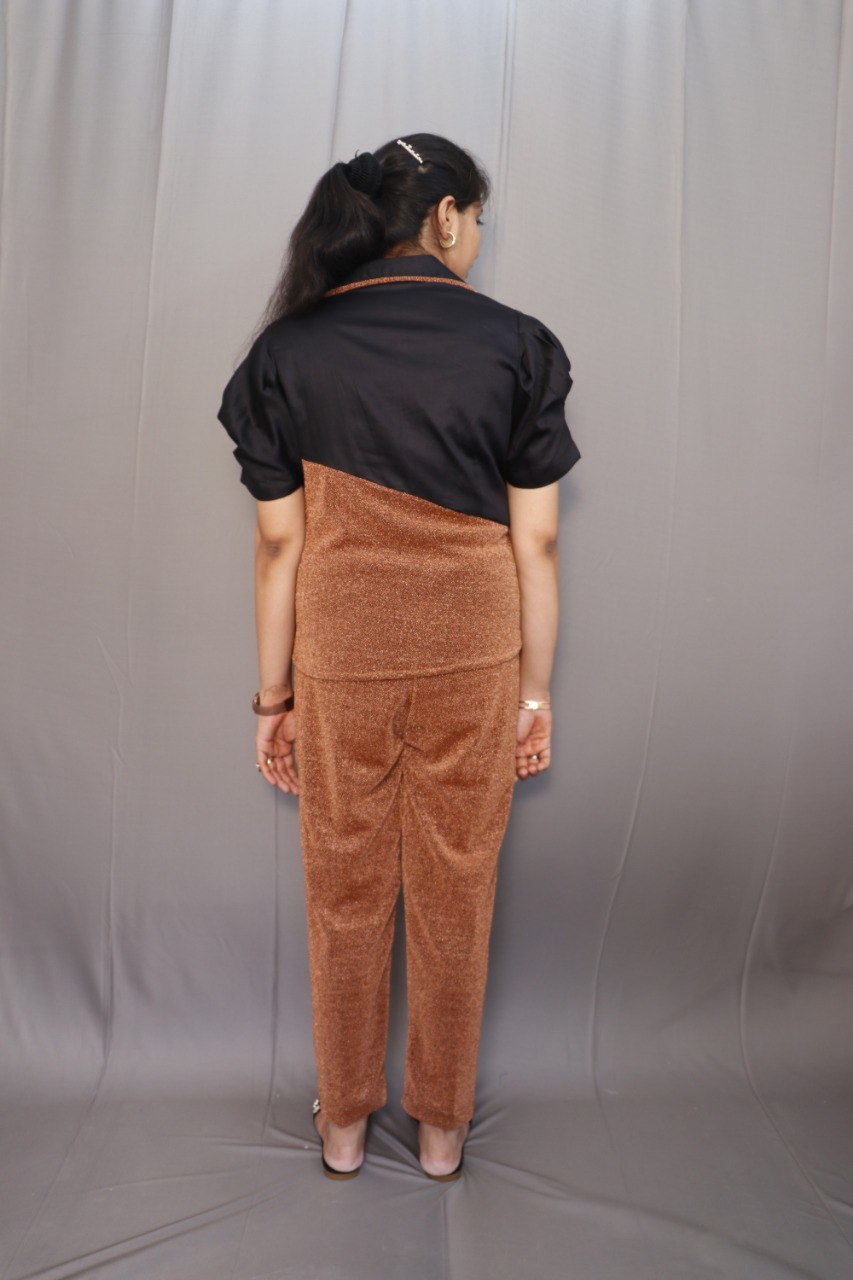 The Astrida Co-Ord Set includes a collared short-sleeve blouse with a unique two-tone panel design. The front features a single button fastening, while the pants have a fitted waist, pockets, and front & back belt with elastic for comfort. This set blends elegance with ease, making it perfect for both casual and smart occasions.