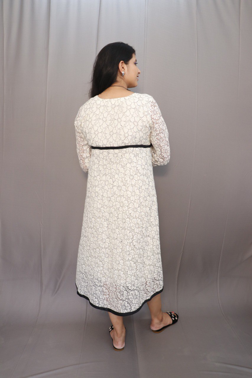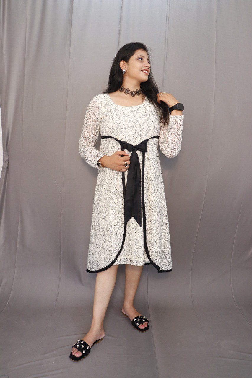 This is a short mini length dress. The Ayca Dress appears to have a fitted straight mini dress underneath the overlay design. This dress features a round neckline and long sleeves. The dress blends a playful short length with sophisticated contrasting elements and an interesting structural design giving it a modern and stylish look.