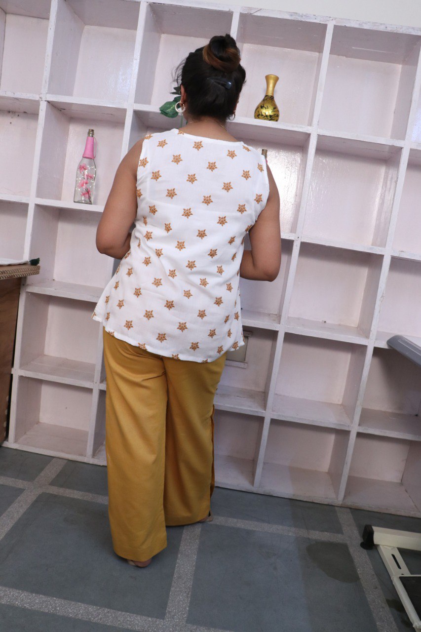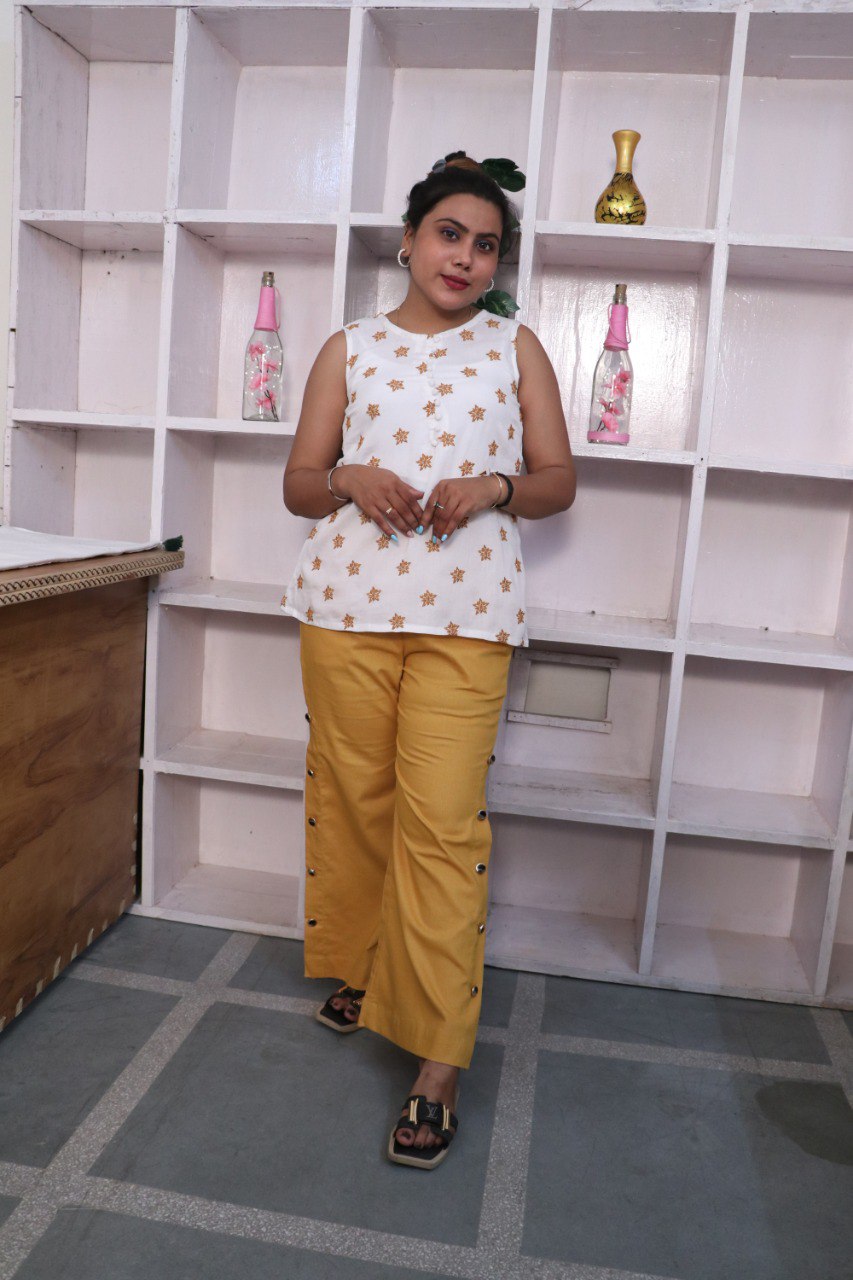 The white top features star-shaped embroidery with a round neckline, while the yellow pants include an elasticated waistband and pockets with button detailing.