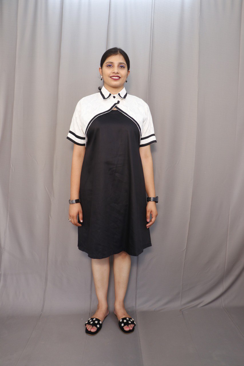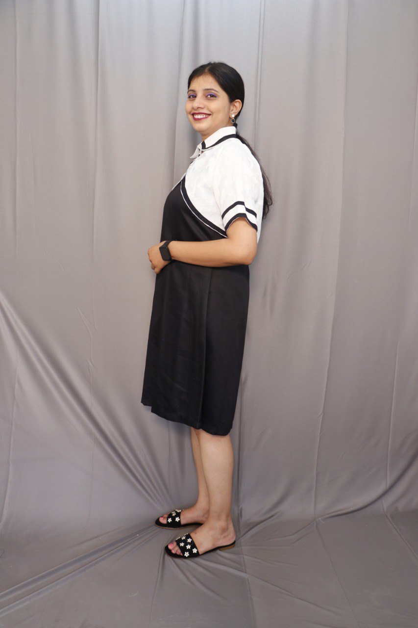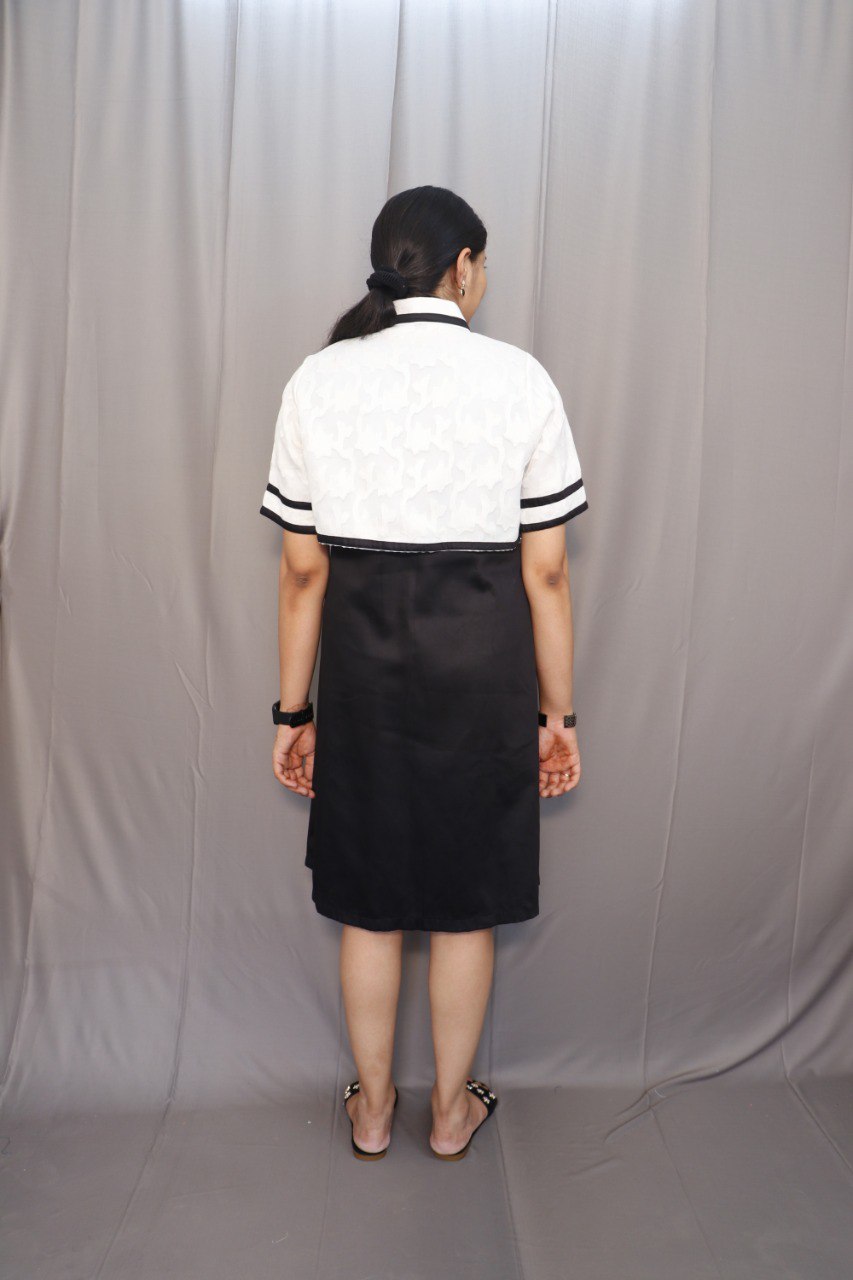 This is a chic and elegant black & white mini dress with a coordinating white short shrug featuring a collar, lapel and piping detail on the sleeves. The design blends classic elegance with modern detailing — a smart choice for semi-formal or business-casual events.