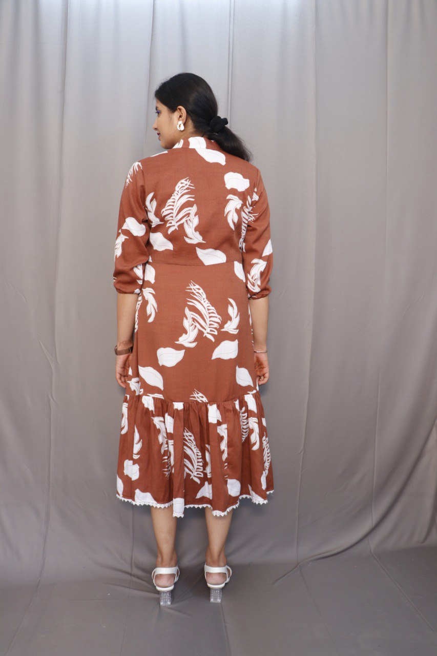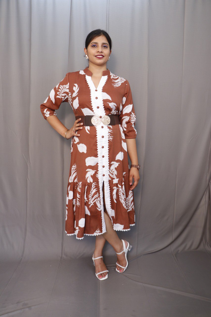 The Flee Dress is a relaxed long dress with a square neckline and 3/4 sleeves. It features a slight flare and slit detail for easy movement, finished with a mandarin-style collar and button placket for a casual yet refined look.