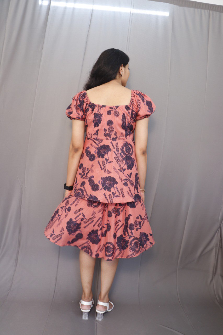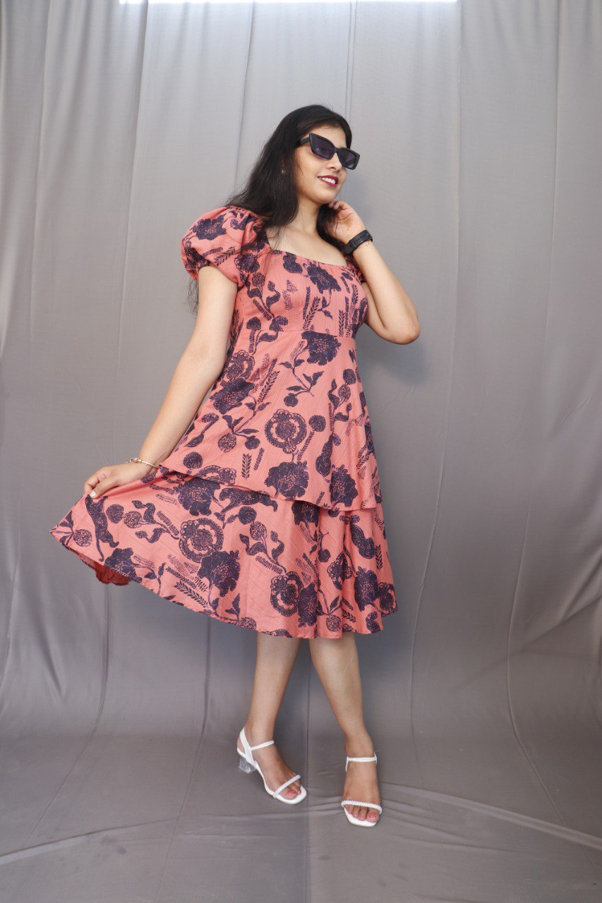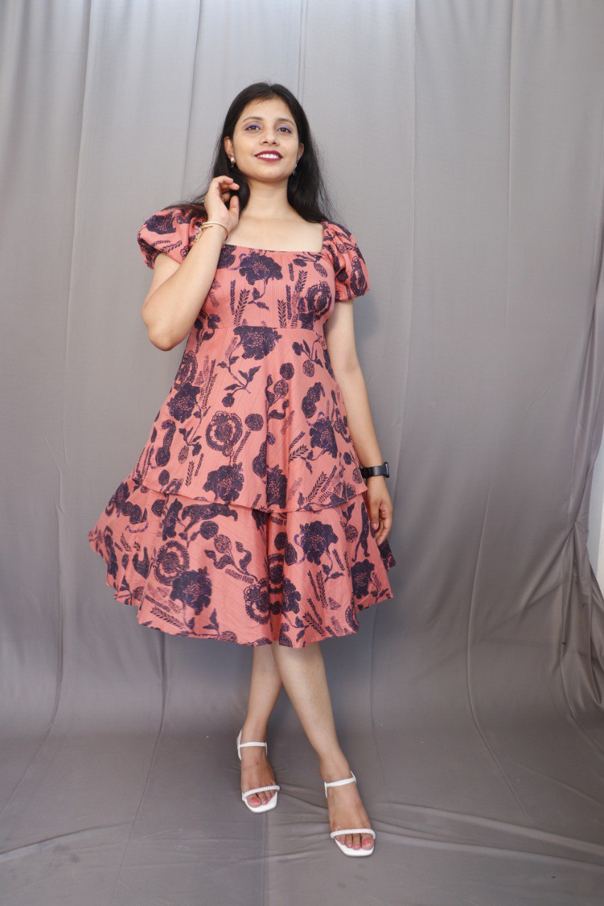 The GEA dress is a peach-and-navy puff-sleeve dress with a distinctive floral pattern and a square neckline. It features ruffle details and a flared silhouette that provides movement and a playful, flouncy look.