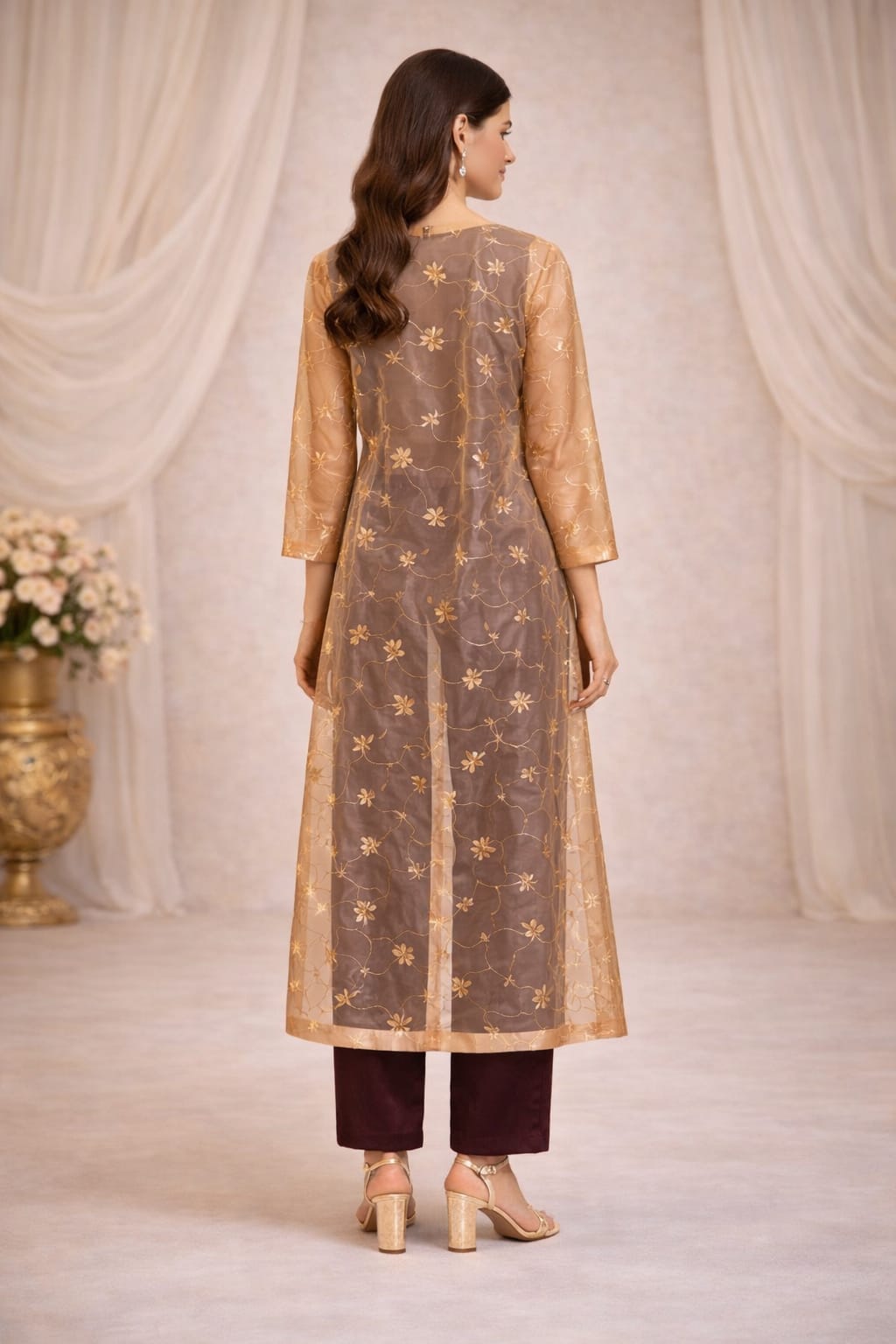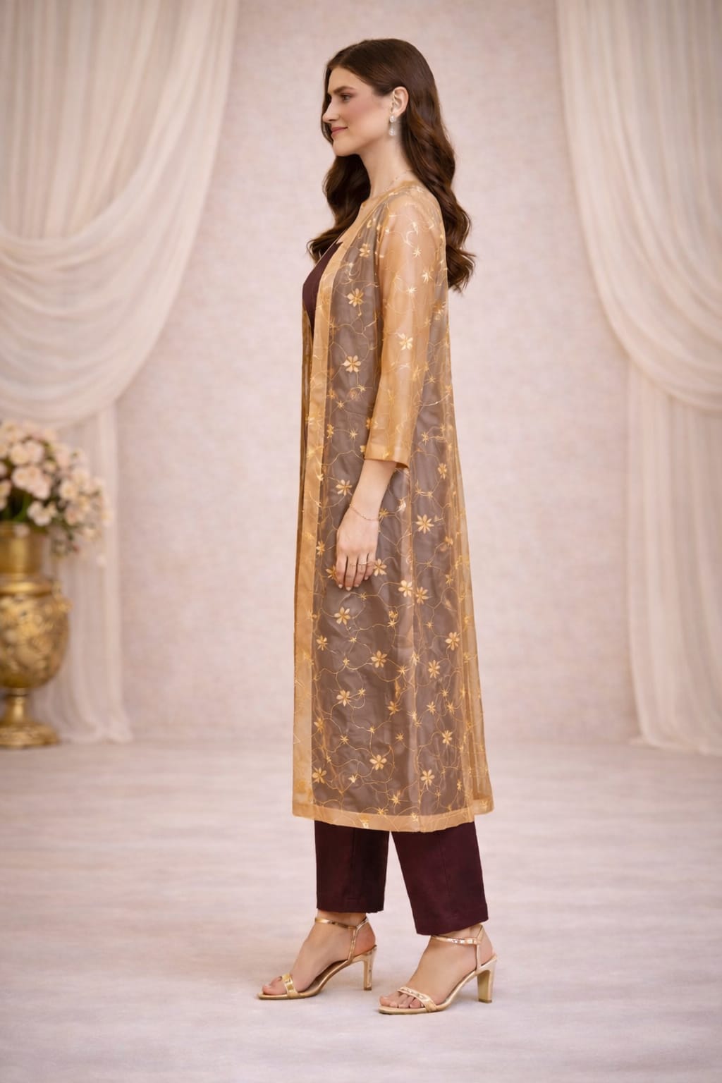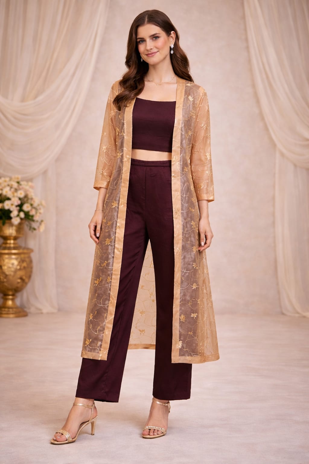 This chic ensemble features a rich coffee-brown crop top, matching straight-fit pants, and a beautifully styled long sheer embroidered shrug in a soft golden-beige tone.