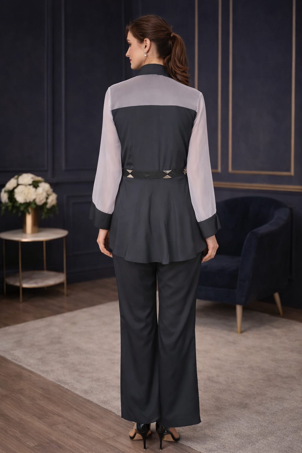 The top is crafted with a smart shirt collar neckline and elegant full sheer sleeves that add softness and sophistication to the design.