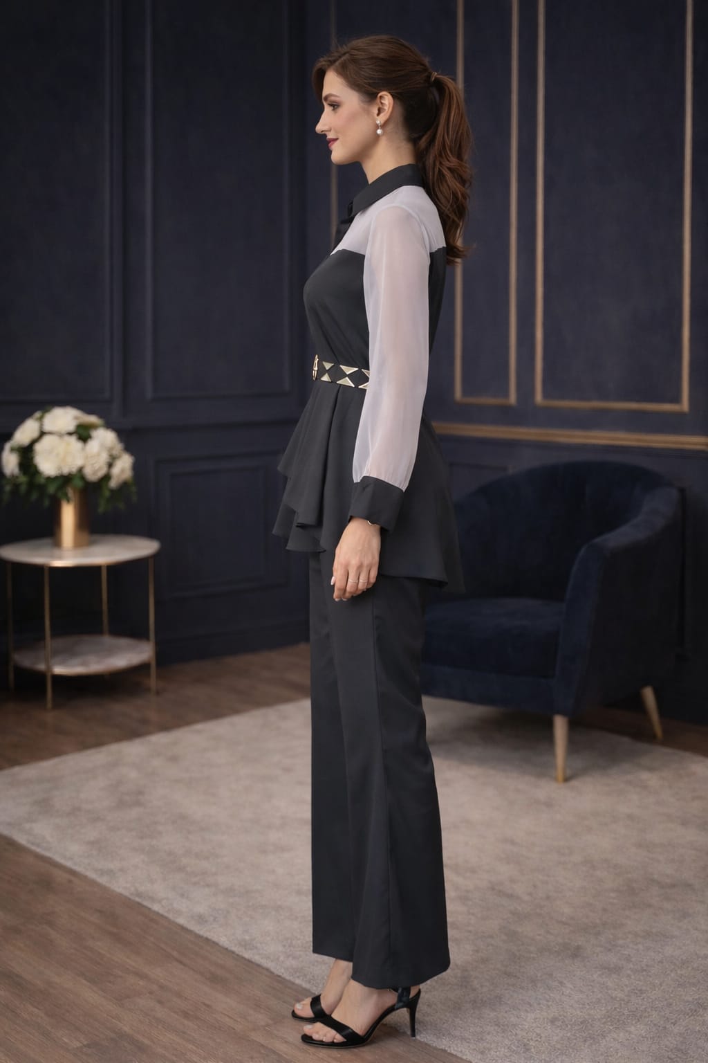 The layered peplum silhouette enhances the waist beautifully, while the stylish embellished waist detail adds a luxurious statement touch.