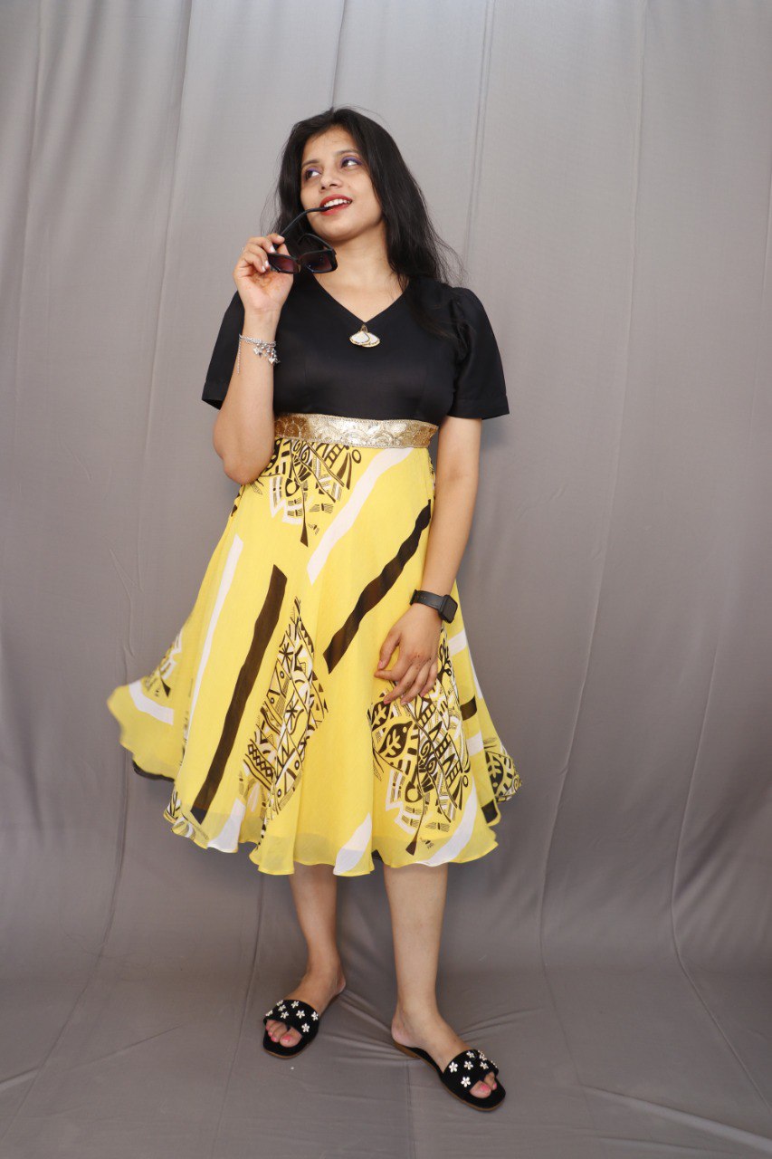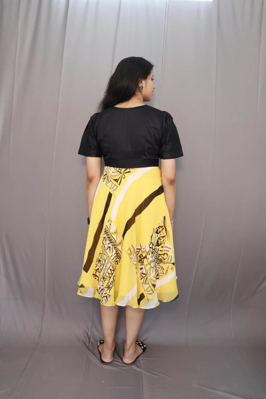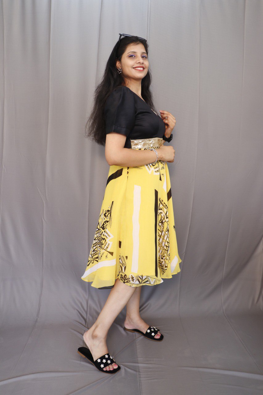 The Buse Dress top is black with short, slightly puffed or gathered sleeves. It has a V-neckline and appears to be fitted. The lower half is a bright yellow that distinguishes itself from the top. The yellow fabric features a bold and striking print in black and white, featuring abstract or geometric patterns. The fabric is light and flowing georgette material, adding elegance. A wide black colour belt is cinched around the waist. It adds a prominent accent to the ensemble.